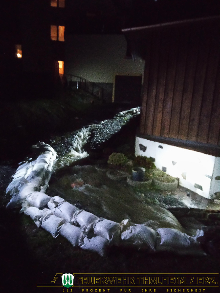 Vor Ort bestätigte sich die Lage. Aus einem verrohrten Bachlauf quellte Wasser in einer Einfahrt und überflutete mehrere Nebengebäude. Mittels Sandsäcke leiteten wir das austretende Wasser an den Nebengebäuden vorbei zurück in den Bachlauf und sperrten die Austrittstelle ab, da diese sich durch die Ausspülung bereits gesenkt hat.
