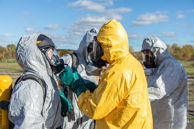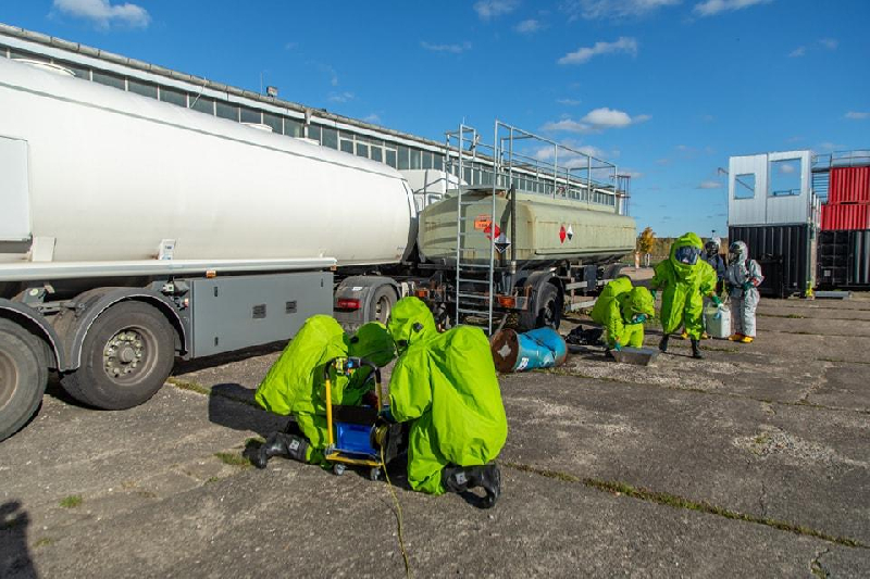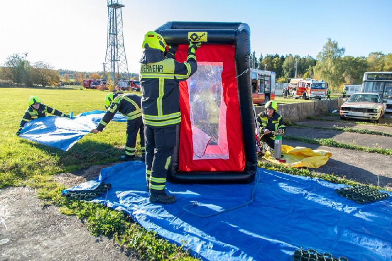 Im Rahmen einer geplanten Einsatzübung des 4. Gefahrgutzuges wurden wir als Dekonkomponente am Samstagvormittag alarmiert. Wir fuhren in den Bereitstellungsraum am Niederdorfer Autohof. Von dort aus verlegten wir geschlossen, mit allen Komponenten des 4. Gefahrgutzuges, zum Übungsort nach Pfaffenhain. Auf dem Gelände des Feuerwehrtechnischen Zentrums wurde ein Gefahrgutunfall mit verletzten Personen und Stoffaustritt inszeniert.